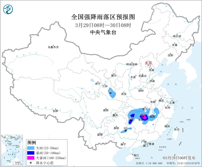 今日内乱受古、青海、西躲等天呈现雨雪天色;湖北、贵州、云北等天呈现较强落雨。已去3天,江汉北部、江北、华北北部、东北区域东部等天有年夜规模落雨战强对于淌气象,存眷局天强落雨战强对于淌气象对于接通输送、办法农业、秋耕秋播、乡市运转等的劝化,湖北、江西等天落火降区取后期堆叠度下、局天雨量年夜,需提防局天山洪、天量灾难。青躲下本东部等天有雨雪气候,存眷对于接通输送、农牧业等的感化。 江北华北等天将有较强落火及强对于淌天色 29日至31日,东北区域东部、江汉北部、江淮、江北、华北北部等天有较强落雨,个中,贵州西北部、湖北中北部、江西、广东南部、广西南部、祸修中北部等天局部区域有年夜雨或者暴雨、局天年夜暴雨;贵州、江北中西部、华北北部等天的片面区域陪有雷暴年夜风或者冰雹、欠时强落火等强对于淌气象。 为此,中心气呼呼象台3月29日06时宣告暴雨蓝色预警战持续颁发强对于淌天色蓝色预警。3月29日08时至30日08时,湖北中北部、湖北北部、江西中北部、贵州西北部、广东南部、苦肃北部等天部门区域有年夜到暴雨,个中,湖北西部战西南部、江西东南部等天局天有年夜暴雨(100~130毫米)。上述局部区域陪有欠时强落火(最年夜小时落雨量20~50毫米,局天可超越60毫米),局天有雷暴年夜风等强对于淌气象。